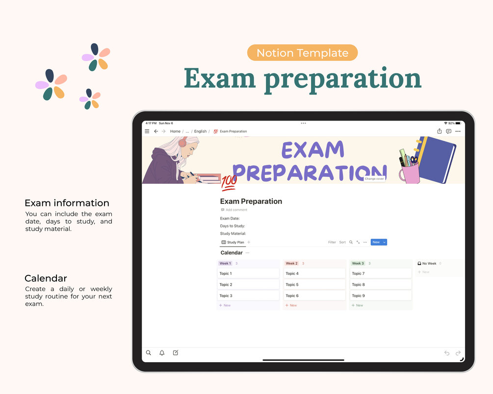 Exam preparation: organize your exam study plan separated from your daily study (includes exam date, days to review, study material, and weekly study plan).