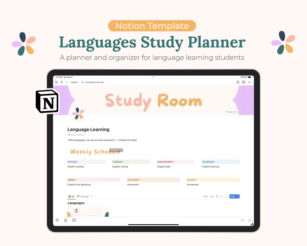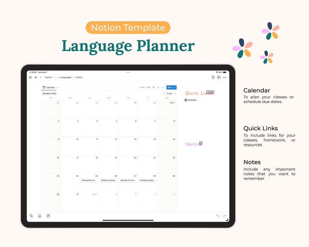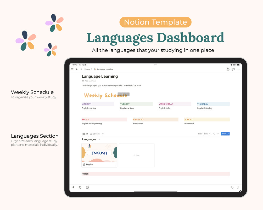 Notion template for language learning. Keep all your language lessons and resources in one place.