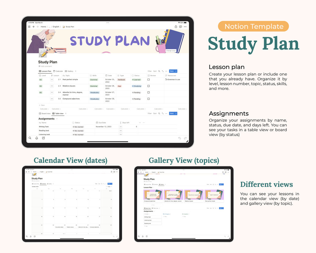 Study plan: (gallery view, table view, calendar view) divided by: level, topic, skills, date, lesson number, status, and resources.